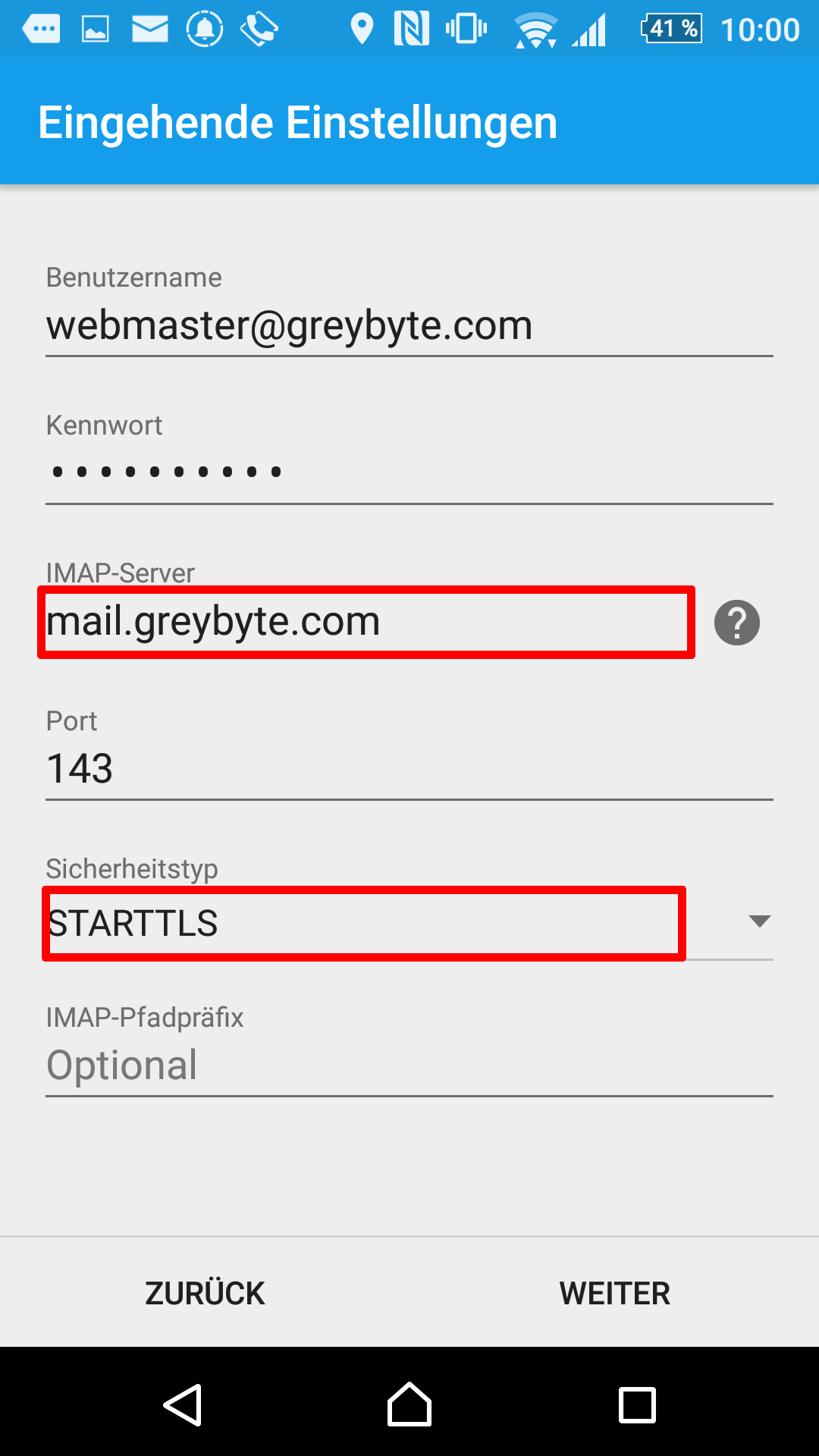 Im dritten Schritt werden Name und Einstellungen des IMAP-Servers abgefragt. Geben Sie als IMAP-Server mail.greybyte.com an und wählen Sie bei "Sicherheitstyp" STARTTLS (diese Option wird bei manchen Geräten auch als TLS bezeichnet). Als Port wird der Standardport (143) verwendet, eine Eingabe bei "IMAP-Pfadpräfix" ist nicht erforderlich.