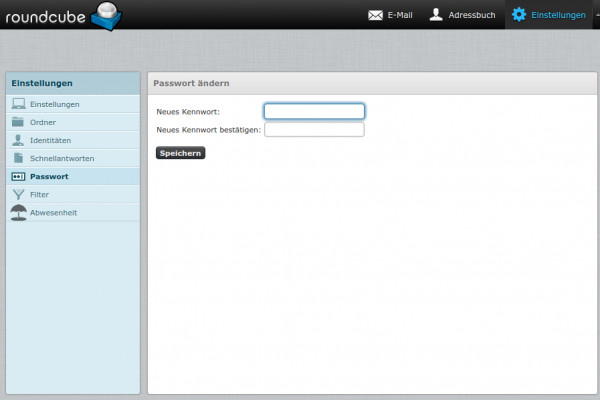 Um das Passwort für ein E-Mail-Konto zu ändern, loggen Sie sich mit der E-Mail-Adresse und dem zugehörigen Passwort in den Webmailer ein. Klicken Sie auf "Einstellungen" (oben rechts) und wählen Sie links "Passwort". Sie können nun ein neues Passwort vergeben: